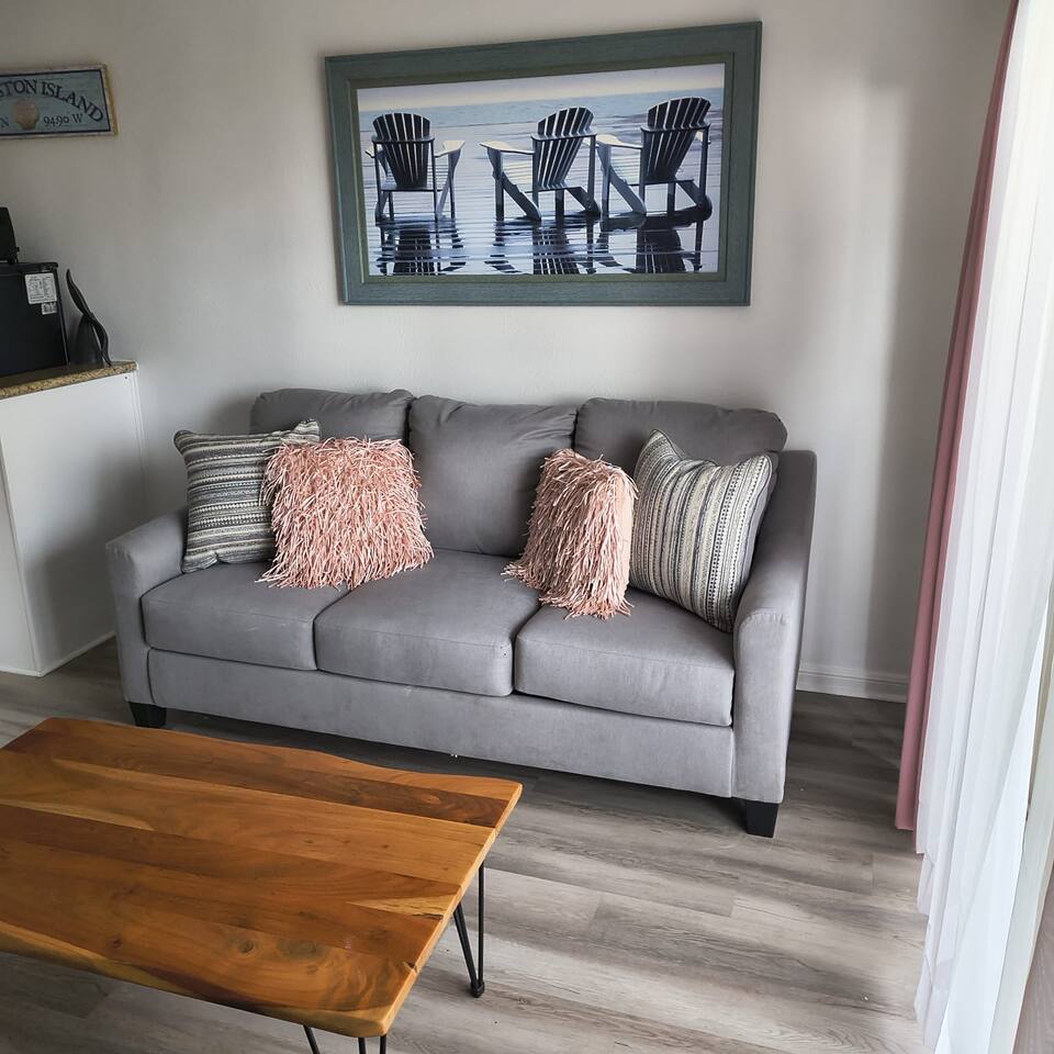Few things offer the escape from a busy life quite like a trip to the beach! This beautifully redone condo just adds to the relaxation of your next escape. From its comfy beds & tasteful décor to its relaxing patio, you have everything you need to unwind and enjoy your Galveston getaway. We are also just 10 minutes away from a family-fun adventure exploring the Rainforest & Aquarium at Moody Gardens or splashing around on a hot sizzling day at Schlitterbahn! Come join us for your next vacation!